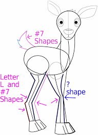 Go back to how to draw animals from the wild go back from how to draw a cartoon deer to home page Sketch two small rectangle on top of the head to create the ears. A nice cartoon deer made with simple shapes! The tail should be small and higher than the body. The middle part will be larger (for the knees) and the bottom part should be bigger, to create the hoof.